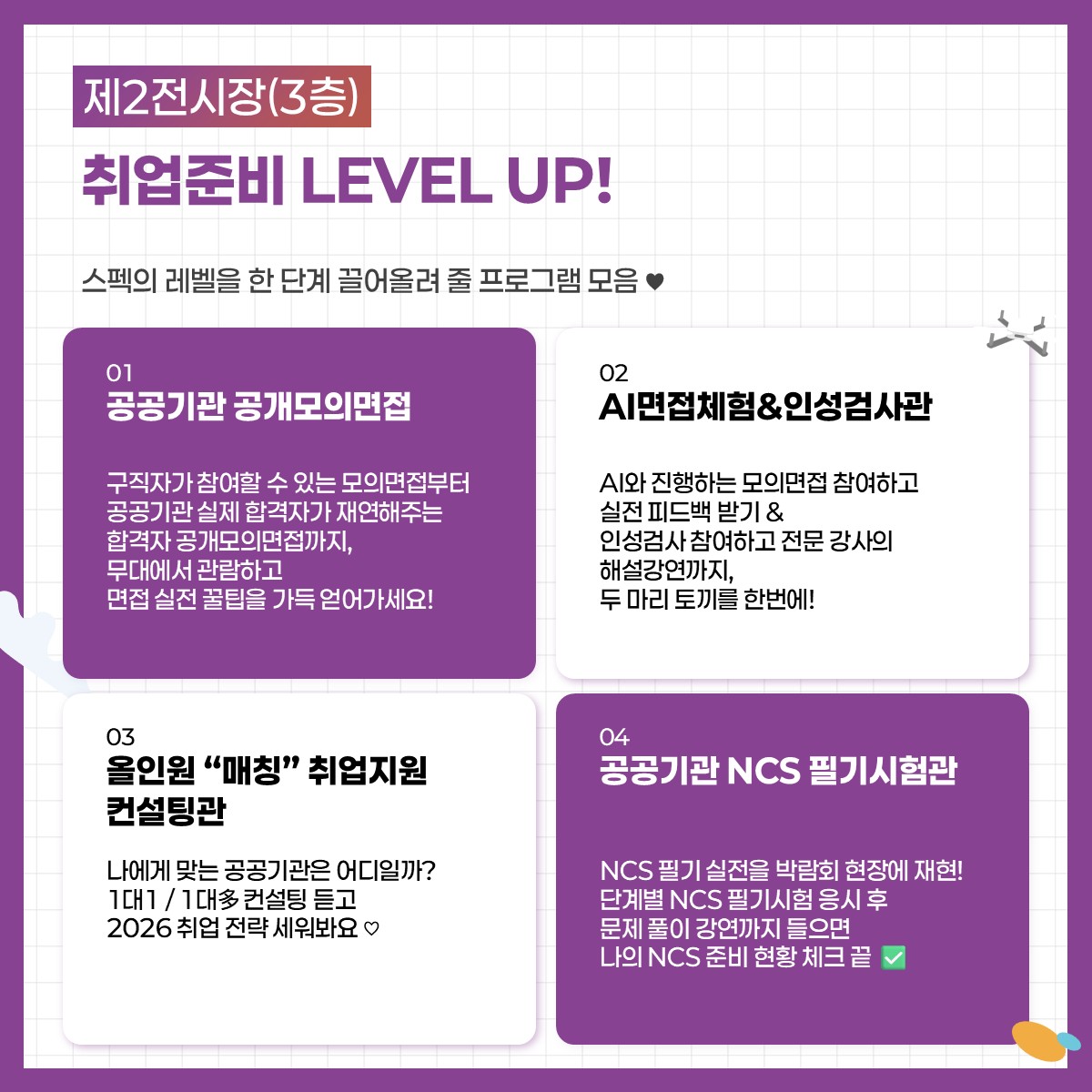 ✔️참여기관 상담을 비롯한 AI면접체험&인성검사관, 올인원 매칭 컨설팅관, 공공기관 NCS 필기시험관 등은 현장 대기를 통해서 참가가 가능해요~!