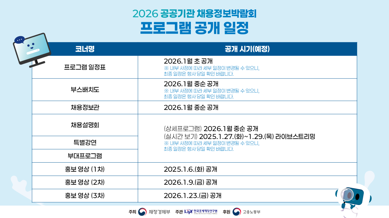 2026 공공기관 채용정보박람회 홈페이지 내 콘텐츠는 12월 말부터 순차적으로 공개될 예정입니다.
